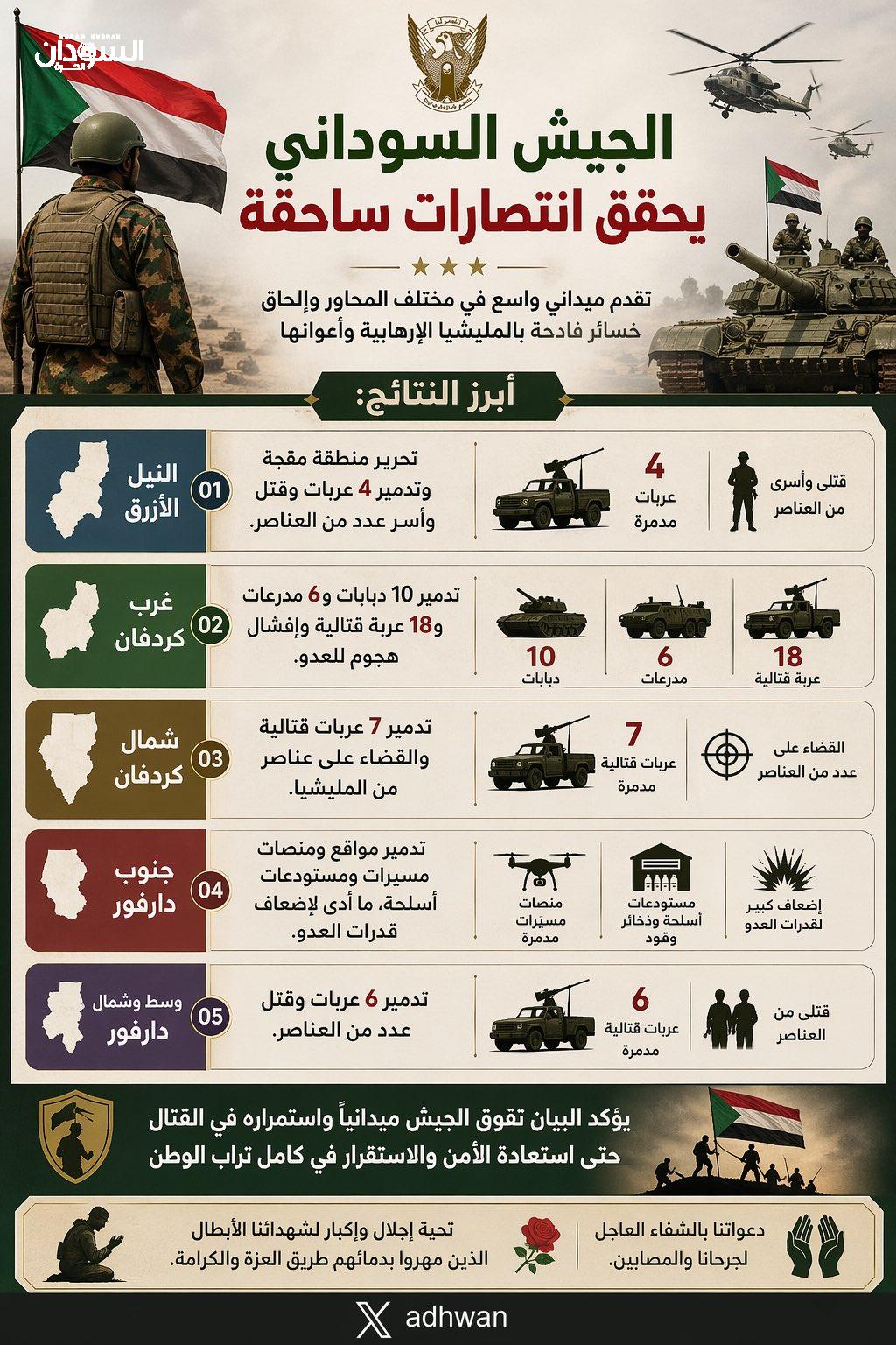 وفي محور شمال كردفان، نفّذت القوات المسلحة عمليات نوعية أسفرت عن تدمير (7) عربات قتالية، والقضاء على عدد من عناصر المليشيا الإرهابية.